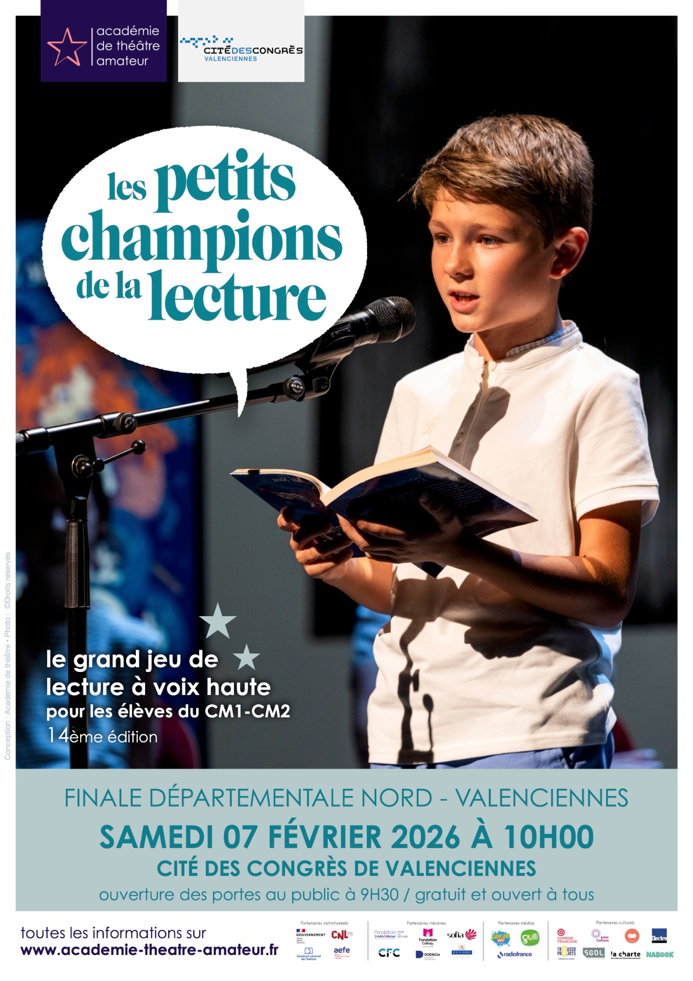 Pour la troisième année consécutive, le comité national des Petits Champions de la Lecture sollicite l'Académie de théâtre amateur pour l'organisation des finales départementales du Nord. Au cœur de la prestigieuse Cité des Congrès de Valenciennes, une quinzaine de Petites Championnes et Petits Champions présenteront leur plus belle lecture au grand public sous la forme d'un show unique et inédit ponctué de performances assurées par les élèves en formation professionnelle de l'Académie internationale de comédie musicale de Lille.