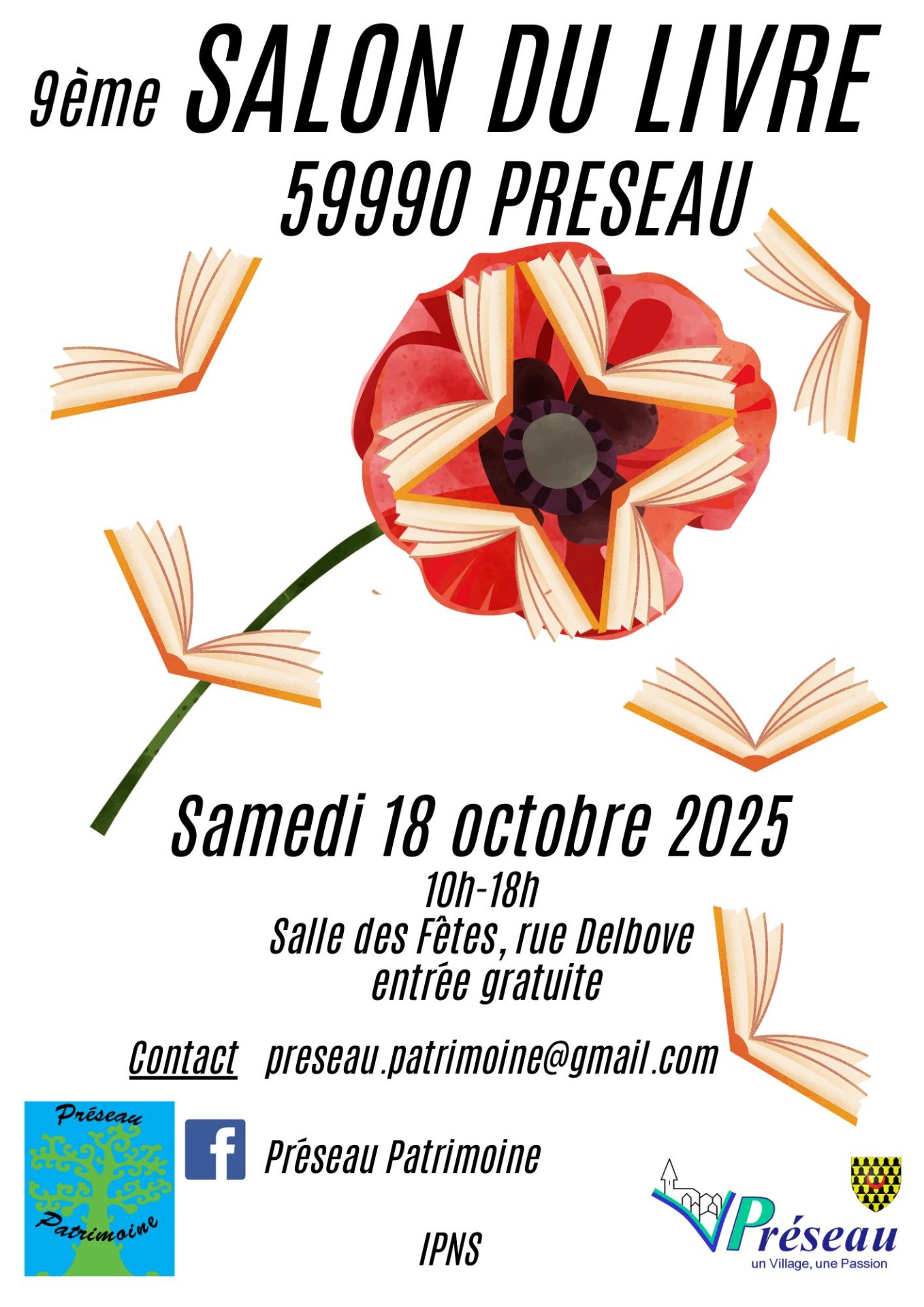 L'association Préseau Patrimoine vous propose son neuvième salon du Livre en date du samedi 18 octobre 2025 dans la salle des Fêtes.