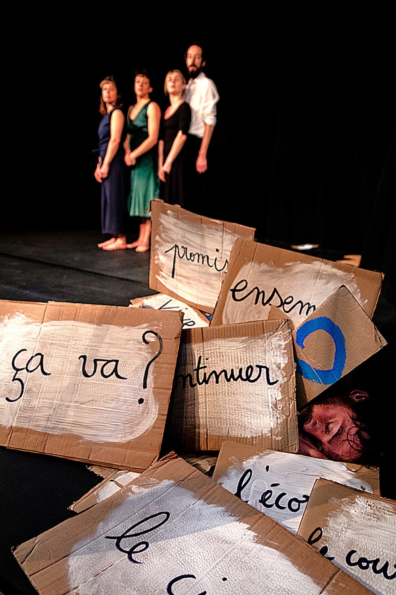 Un choeur de six humains débarque sur le plateau au milieu d'une multitude de mots peints, et explorent leur rapport aux vérités, aux croyances qui nous tiennent, aux masques que l'on revêt pour le grand jeu de l'existence. Ils chantent, dansent, cherchent dans un décor fait de tas de papiers et de pancartes, comme autant de possibles réponses. Oscillant entre fragilité brute et poésie foutraque, ils s'inventent des rituels improbables, mus par une quête impérieuse de sens. Où trouver les réponses à nos vertigineuses questions ? Qu'avons nous à partager avant l'ultime voyage ?