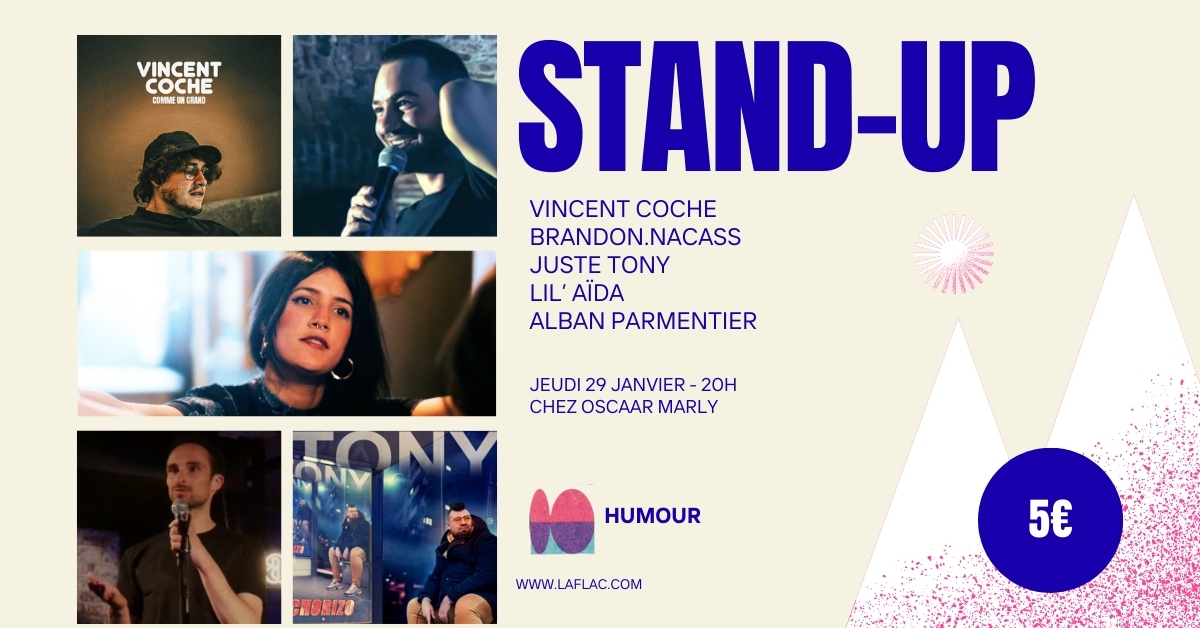 Au programme : 5 humoristes se succéderont sur scène pour des sets de 15 minutes environ avec des univers variés.