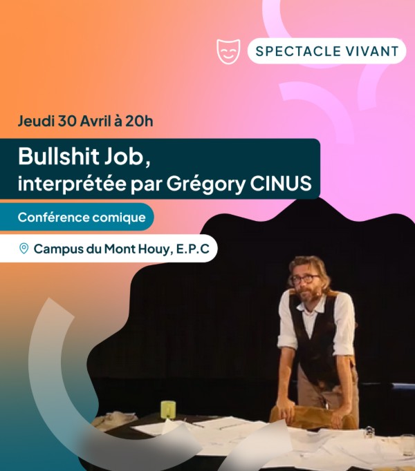 Entre seul en scène et conférence gesticulée, Grégory Cinus donne vie à l'univers de l'anthropologue David Graeber et à ses fameux « jobs à la con » si répandus aujourd'hui.