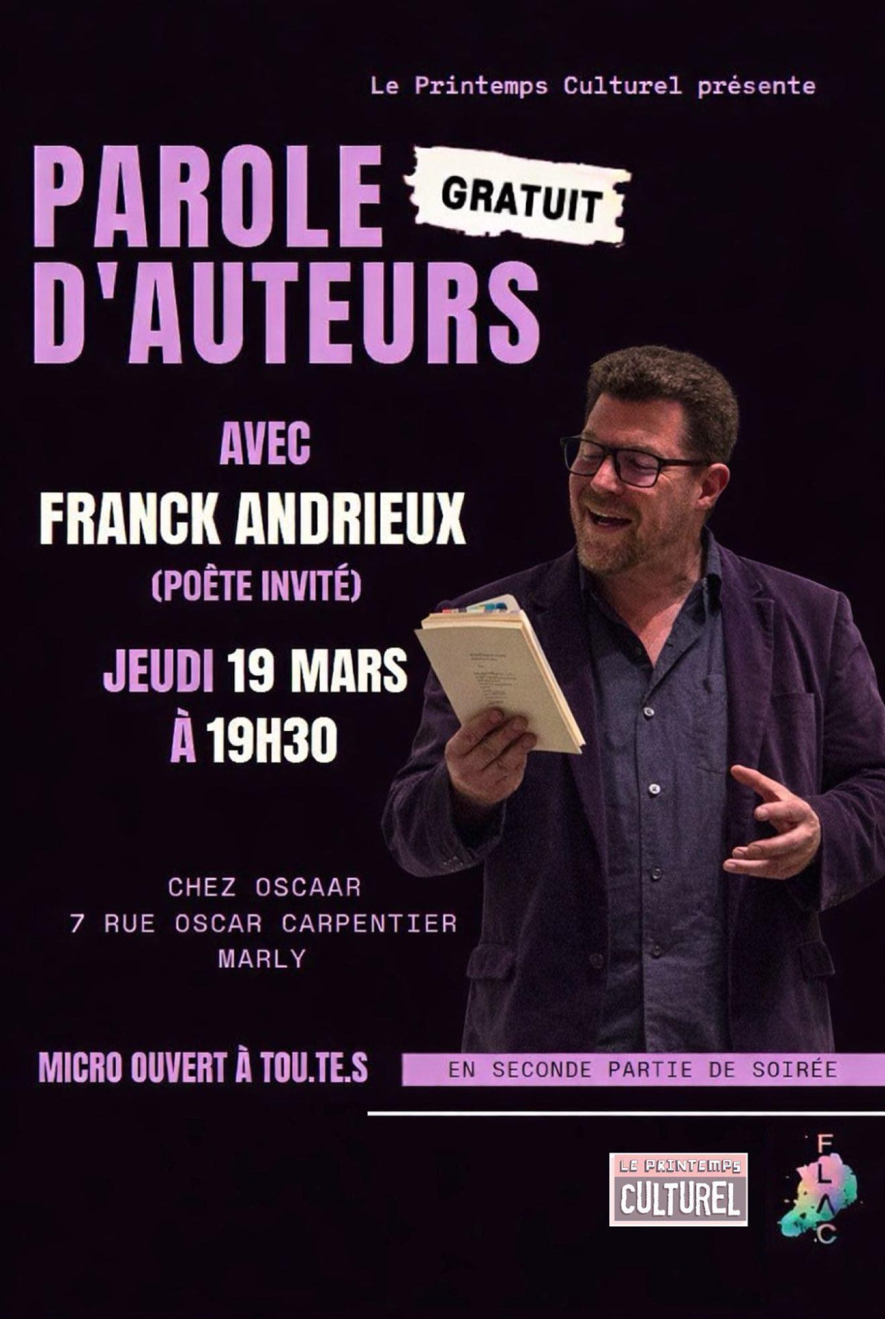 La soirée Parole D'auteurs du 19 mars à Marly se déroule le lendemain de la sortie officielle de Épreuve & Erreur à Paris. Une primeur qui aura selon Franck Andrieux la forme « d'une poésie de l'oralité faite pour être dite ». Car c'est aussi en sa qualité d'homme de scène que Franck se présentera, « je suis interprète scénique, c'est un atout, je suis un raconteur d'histoires ».