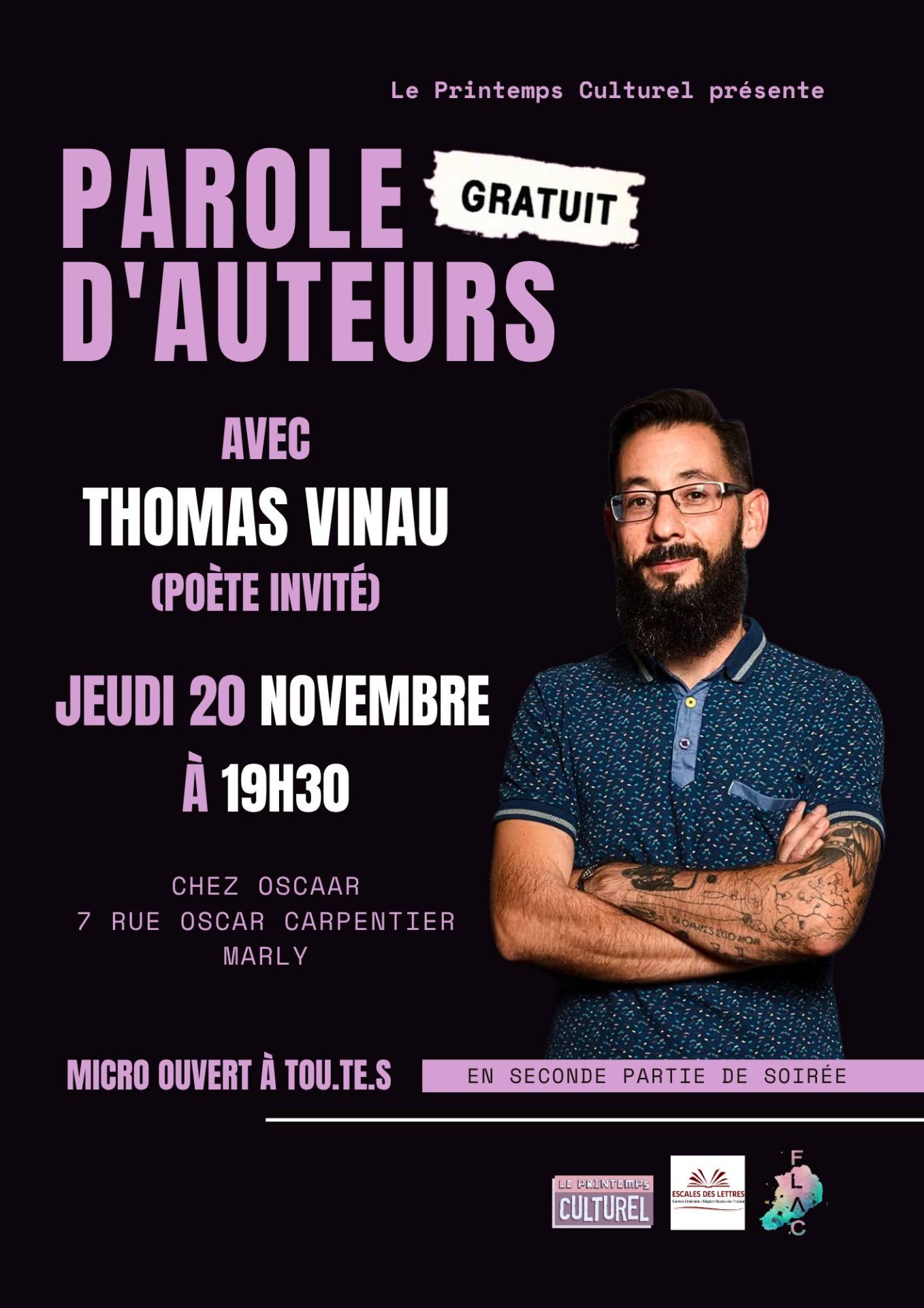 Un cheminement qui passe par Marly et le tiers-lieu de la FLAC, chez OSCAAR le jeudi 20 novembre pour une nouvelle soirée « Parole d'auteurs ». Au Printemps Culturel, on se félicite de la participation de l'auteur à ces soirées où le micro est partagé entre invités et public, surtout que dans l'univers de Thomas Vinau il est dit que « la poésie peut raconter des histoires ».