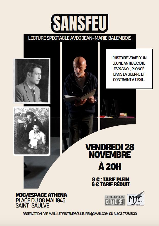 Si le nom de Alfonso Garcia Reseco ne vous dit rien, le contexte de son militantisme vous est sûrement plus familier. C'est l'Espagne de 1936, c'est la nécessité d'un antifasciste intransigeant face au franquiste armé militairement. Du combat en uniforme jusqu'aux camps de travail et le bagne, c'est ce parcours qui est mis en avant dans SansFeu, une lecture spectacle avec Jean-Marie Balembois, dans une mise en scène de Dominique Surmais. C'est à l'espace Athéna de St Saulve que se tiendra la représentation du vendredi 28 novembre, décrit comme un « vivant témoignage dépeint avec acuité ce que vécurent ces hommes traités comme la lie de la terre ».