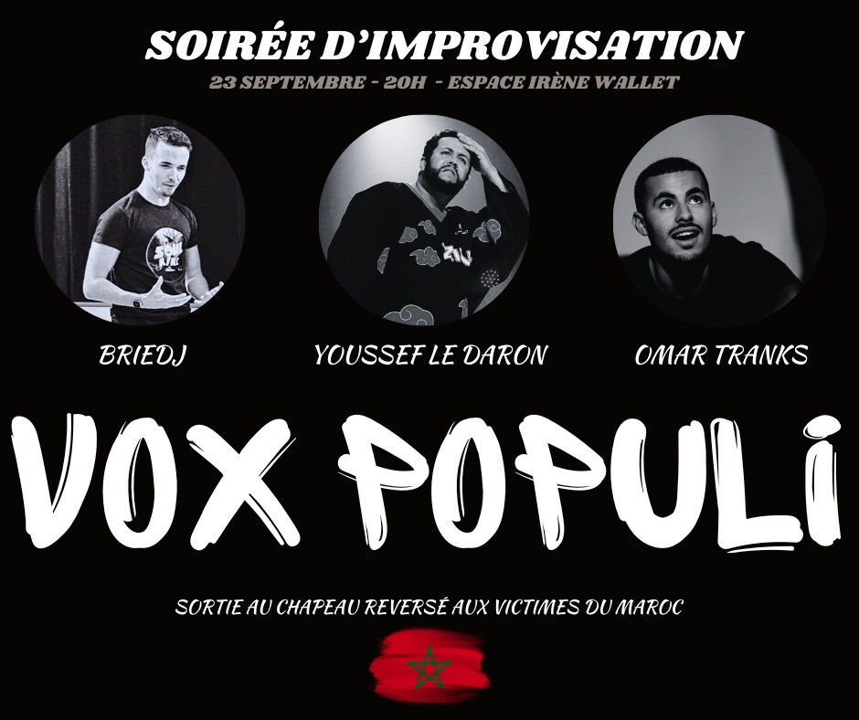 La troupe des Zinc et leurs amis organisent leur soirée de rentrée à Condé sur l'Escaut. Des passages animés où vous déciderez des thèmes qui seront développés. Une ambiance conviviale qui de surcroît sera l'occasion d'une collecte de dons pour les sinistrés du Maroc.