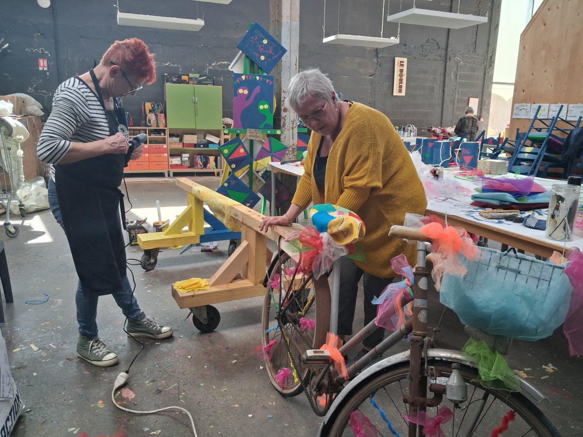 Alors que certaines continuent à décorer le « vélo-tracteur », qui sera à coup sûr une des stars de la décoration des Turbulentes, une discussion s'engage. Marlène nous parle d'un intérêt personnel pour les loisirs créatifs, et « d'être entre amies » en lançant un regard complice autour d'elle. C'est qu'elles font corps ces Petites mains, « c'est une équipe » insiste Bernadette. Leur atelier tient de la ruche où telles des abeilles leur travail est commun sans être hiérarchisé.