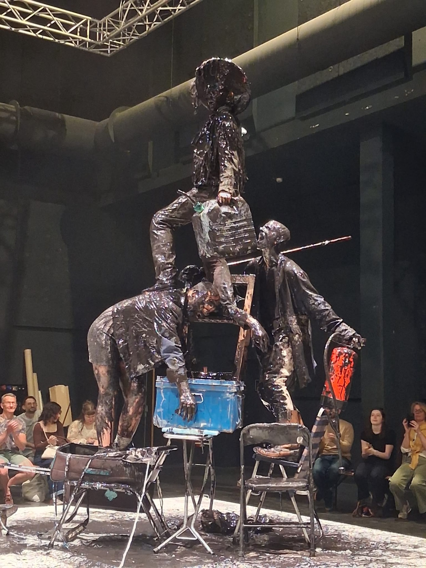 On a été prévenu, pas possible de dire le contraire. Quand au Boulon on présentait People avec l'accroche « quelle que soit la forme que vous pourriez attendre. Oubliez la », on ne pouvait pas toucher la vérité au plus près. Et pourtant, au micro de Romain Carlier pour le podcast du CNAREP, Claudio Stellato avait donné quelques pistes de compréhension, « rendre spectaculaire l'art plastique ». Tout cela donne des éclairages, mais comme souvent dans l'art vivant de la scène, c'est le vécu qui prime. Ainsi, pour avoir assisté à la sortie de fabrique de People le 23 avril avant ses représentations dans le cadre des Turbulente les 2 et 3 mai, c'est à notre tour de tenter l'exercice périlleux du compte-rendu.